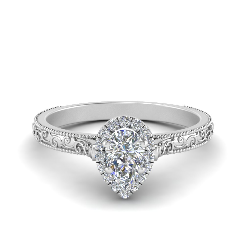 "Worn With Meaning" Sterling Silver Hand Engraved Pear Shaped Halo Engagement Ring